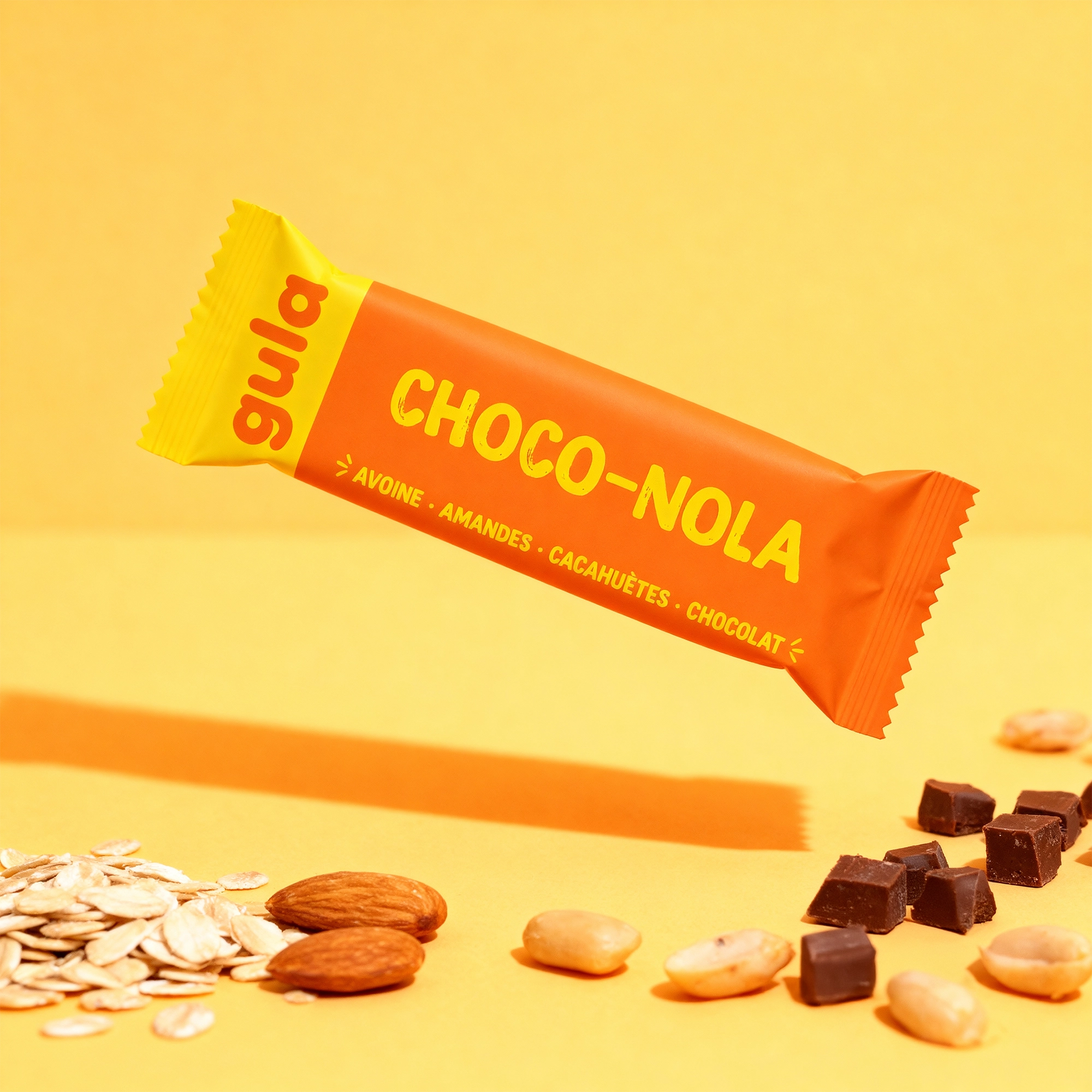 La base de notre barre est un délicieux muesli croustillant, préparé avec soin. Les flocons d'avoine sont mélangés avec des fruits à coque et du chocolat, puis dorés au four pour obtenir ce croquant inimitable. Cette base gourmande est ensuite enrichie d'amandes, de purée d'amandes et de pépites de chocolat pour une expérience 100% plaisir.